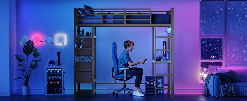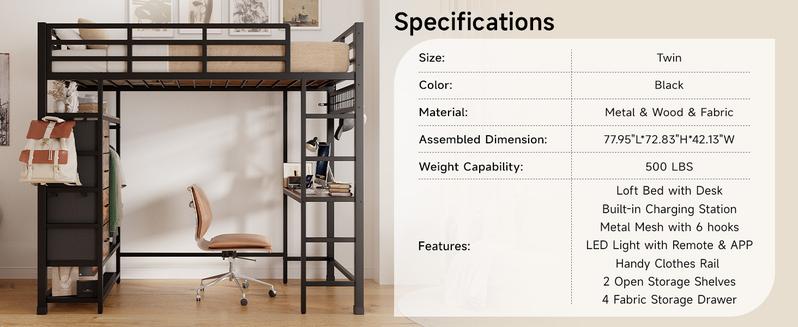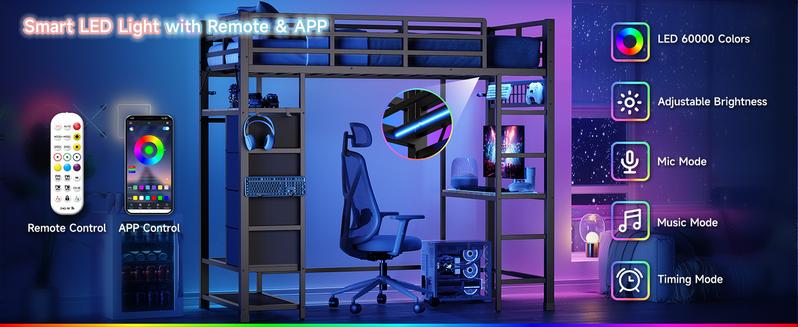 - Loft Bed with Smart RGB LED Lights: This metal loft bed with RGB LED lights can be controlled by an app or a remote. Over 60000 colors of light can be adjusted, and you can also customize brightness, color, mode, and timer settings. Creating your favorite bedroom atmosphere. Sleek black finish complements any room decor while maintaining a contemporary look and feel