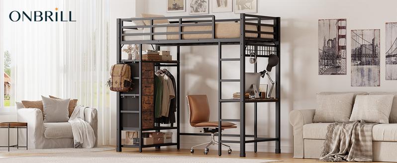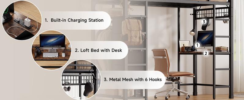 - Loft Bed with Desk and Outlet: This twin-size loft bed features a built-in 39"L x 14.2" W desk for work or study, along with 2 AC outlets, 1 USB, and 1 Type C charging station to keep your devices powered. It creates a functional, simple space for work, study, or gaming. combines sleeping space with a functional workspace underneath