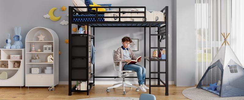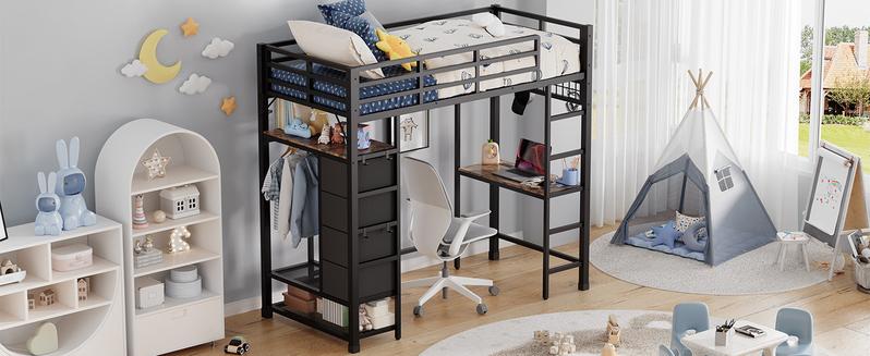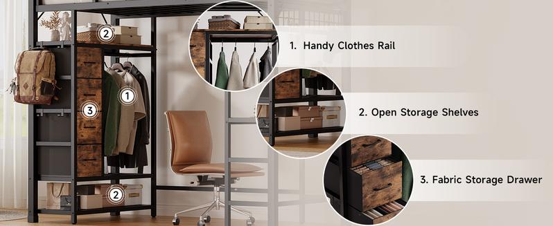 - Loft Bed with Multifunction Storage Space: This heavy-duty loft bed has practical storage space, 4 fabric drawers for underwear and socks, 2 open storage shelves to place your photos, decorations, or other items. There’s also a clothes hanging rail providing a convenient spot to hang up the scarves and clothes. And the decorative metal mesh, plus 6 hooks effortless storage of small items. Maximize space while keeping a clutter-free environment