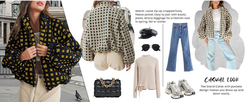 Features: The women's casual fleece coat features with long sleeve, zip front closure, elastic drawstring hem design, baggy and cozy fit; Its trendy checkered pattern makes it a fashionable choice for everyday wear or special occasions