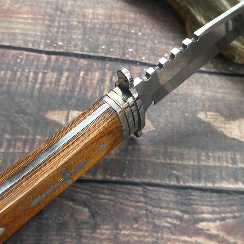 The blade of this knife is silvery white with a delicate metallic luster and a sharp edge. The upper part of the blade is equipped with serrations to assist in sawing. The handle is made of reddish-brown wood, featuring natural textures on its surface, and is inlaid with a white cross-shaped decoration. It is firmly connected to the blade with silver rivets, fitting comfortably in the palm when held. At the junction of the handle and the blade, there is a silver metal guard with smooth edges, which can effectively prevent the hand from sliding towards the blade edge, enhancing safety during use. The matching sheath is made of black canvas, with striking red stitching along the edges, and closes with a silver snap button. When stored, the blade fits tightly with the sheath, which can effectively protect the blade. The side of the sheath is provided with a black webbing for easy hanging and carrying outdoors. The entire knife, with its silvery white blade, reddish-brown wooden handle, and black sheath with red stitching, has a harmonious color combination. The serrated blade expands its cutting and sawing functions, the wooden handle ensures grip comfort, and the practical canvas sheath meets the needs of outdoor scenarios, combining craftsmanship and functionality.